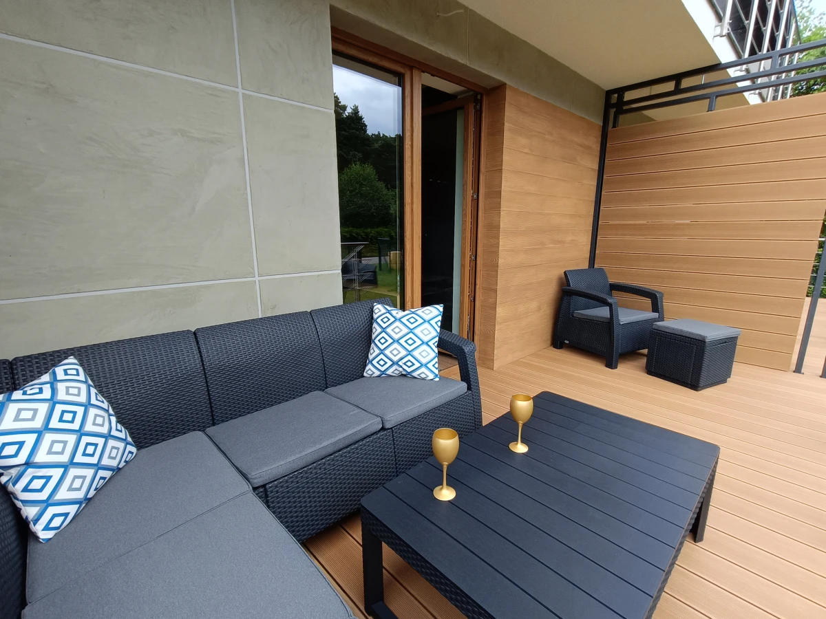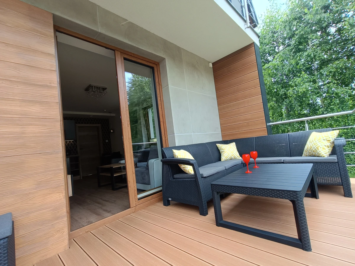 Balkon lub taras z prywatnym ogródkiem (apartamenty na piętrze i parterze) Dodatki i udogodnienia: