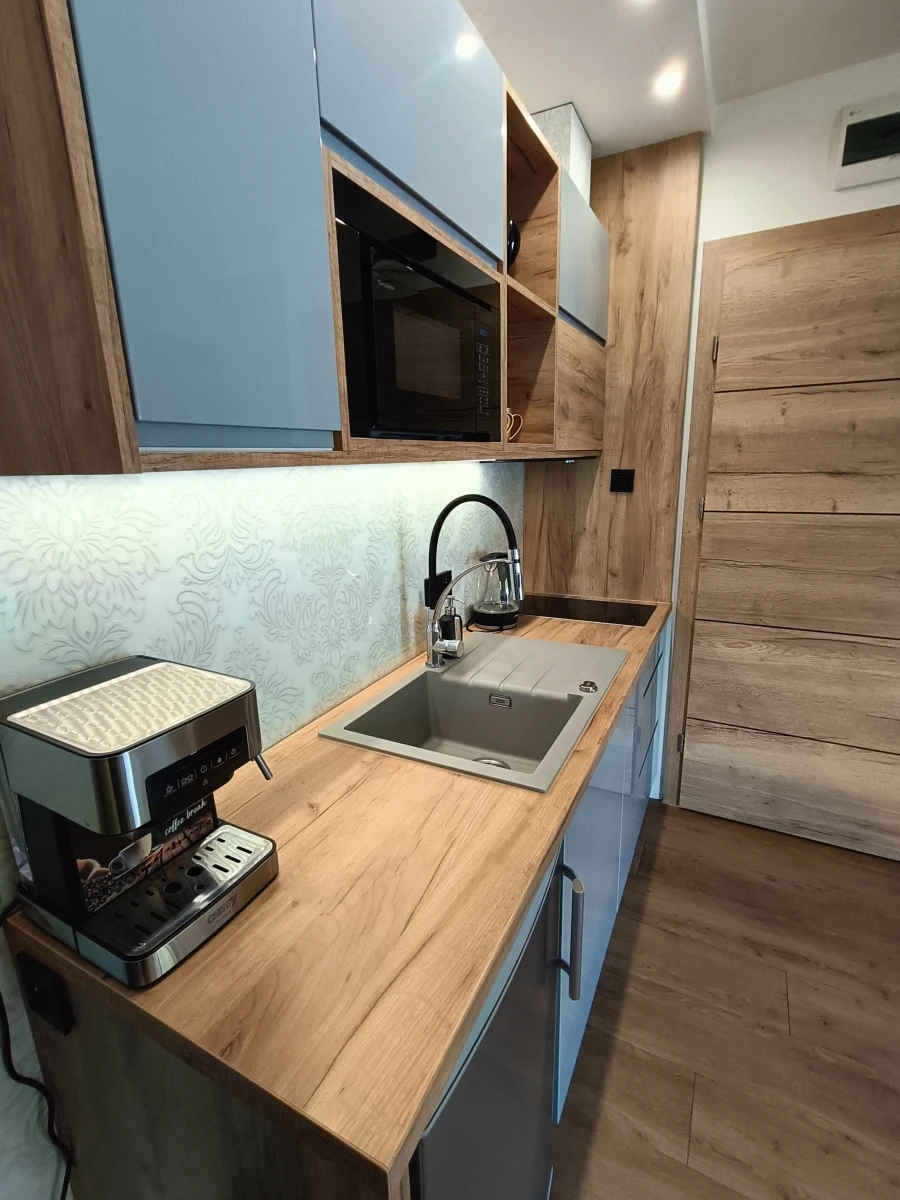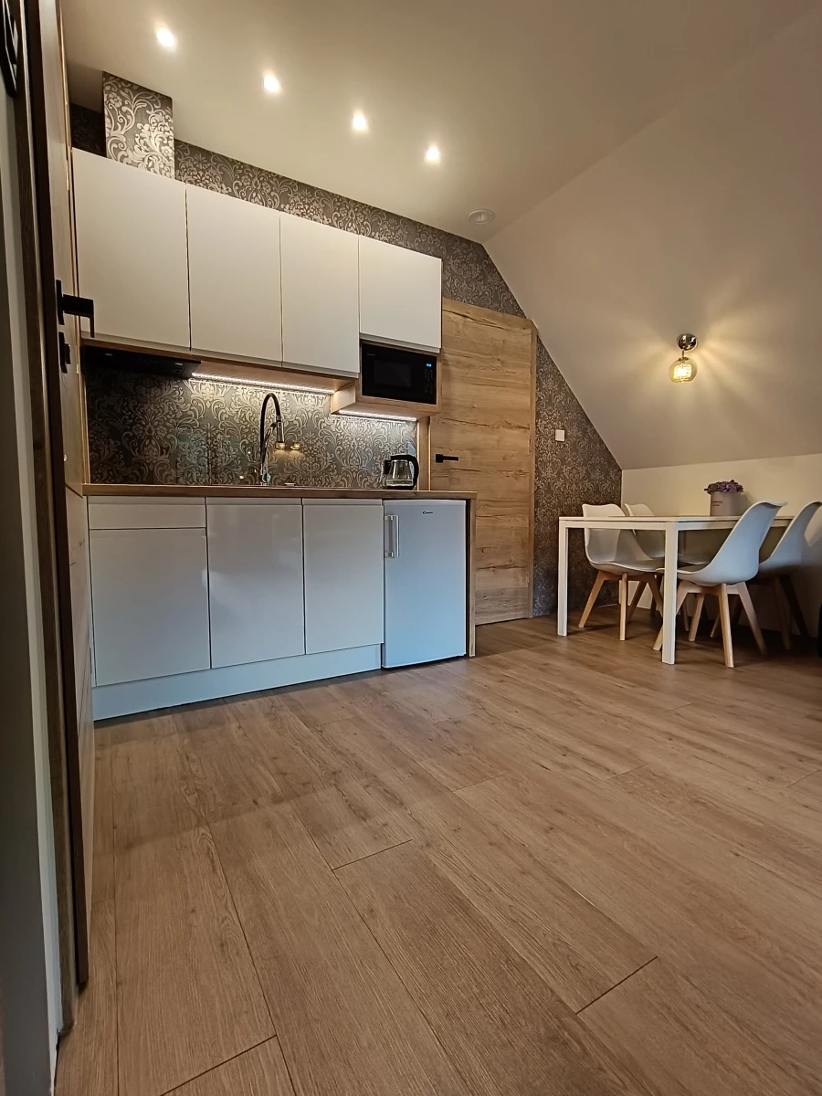 W pełni wyposażony aneks kuchenny: lodówka z zamrażarką, mikrofala, płyta ceramiczna, ekspres do kawy, czajnik elektryczny i pełna zastawa
