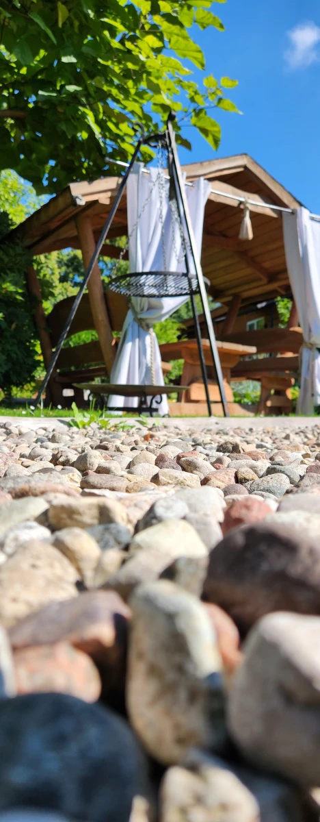 Przy każdym domku zadaszone siedzisko i grill.