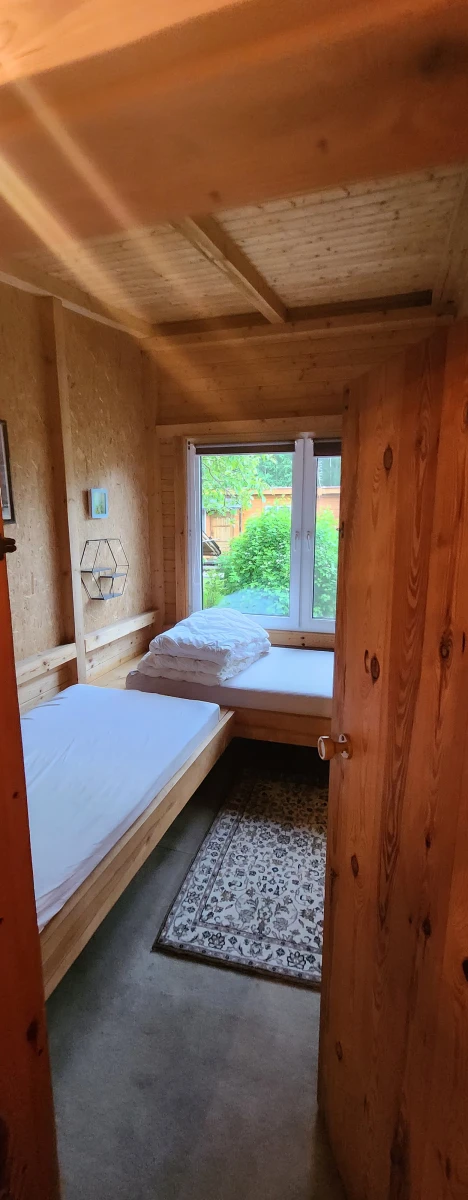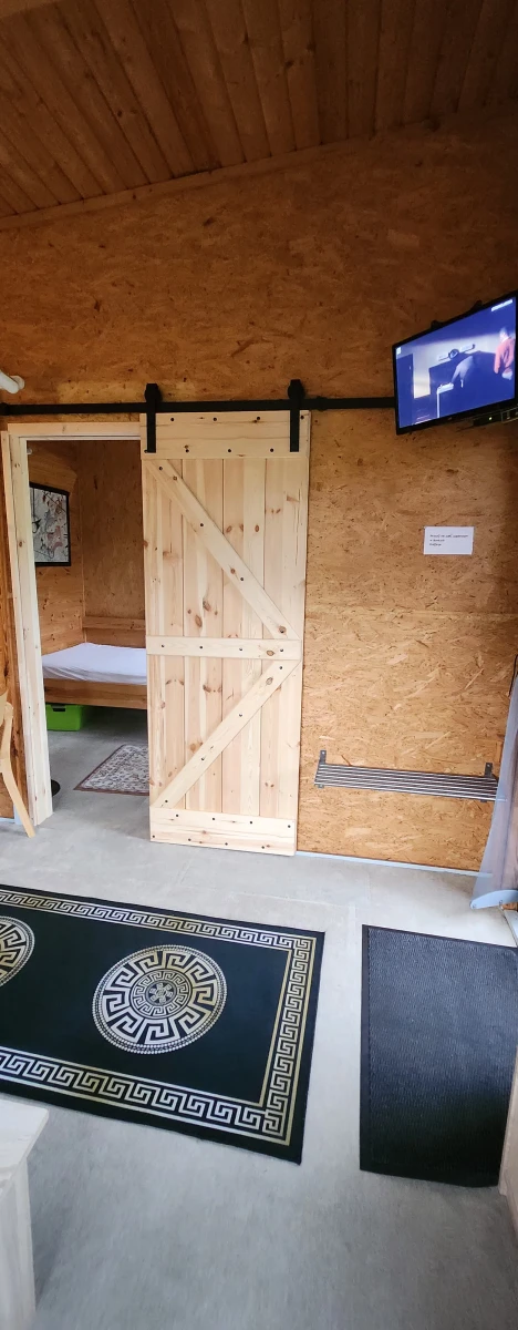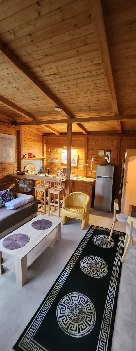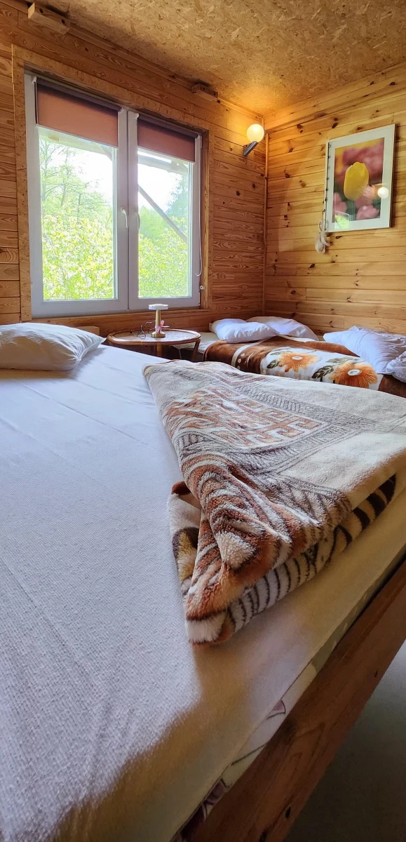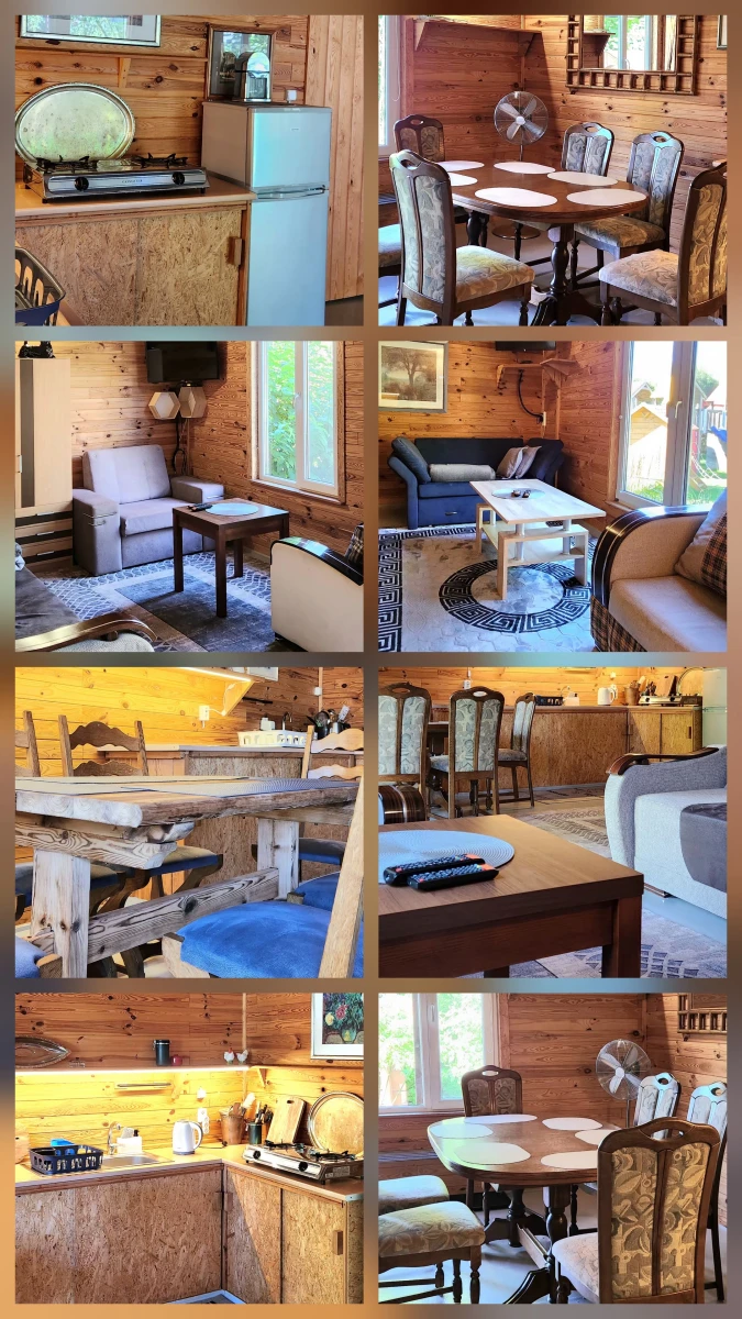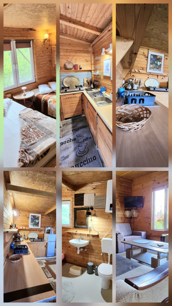 Domek dla rodziny 5 os ok 50mkw. Każdy domek posiada pokój dzienny z aneksem kuchennym , spaniem dla 2 os ( rozkładana sofa 2 os ).