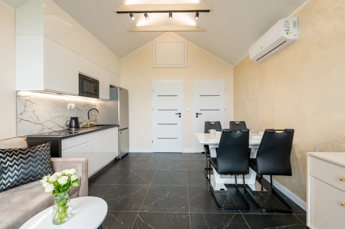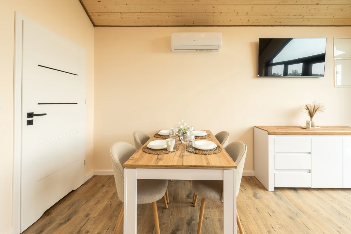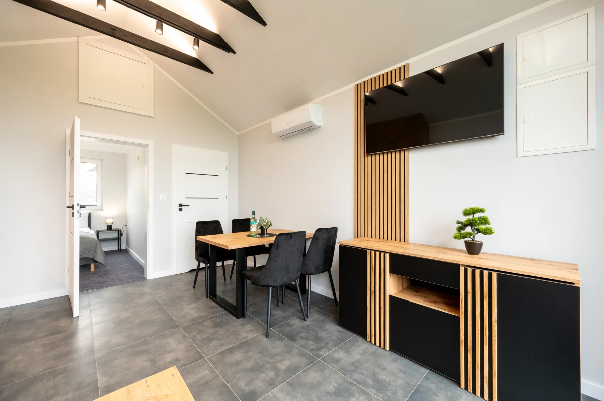 Salon z aneksem kuchennym, TV, klimatyzacja z funkcją grzania, WiFi, Netflix - umożliwiony dostęp z własnym kontem do platformy.