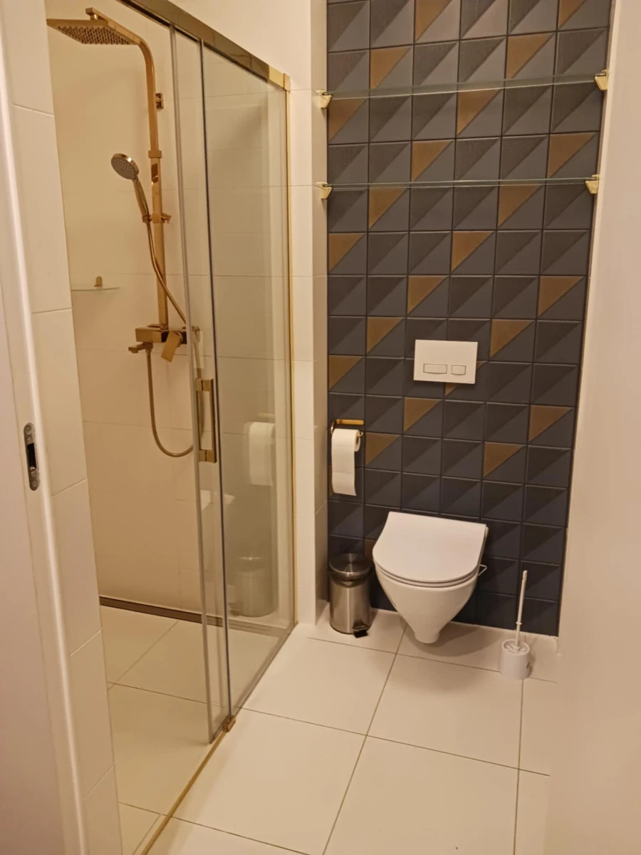 W części kuchennej wysokiej klasy nowoczesna płyta indukcyjna, zmywarka, lodówka, piekarnik, mikrofalówka, toster, sprzęt AGD –czajnik bezprzewodowy oraz pełna zastawa kuchenna wraz z przyborami.