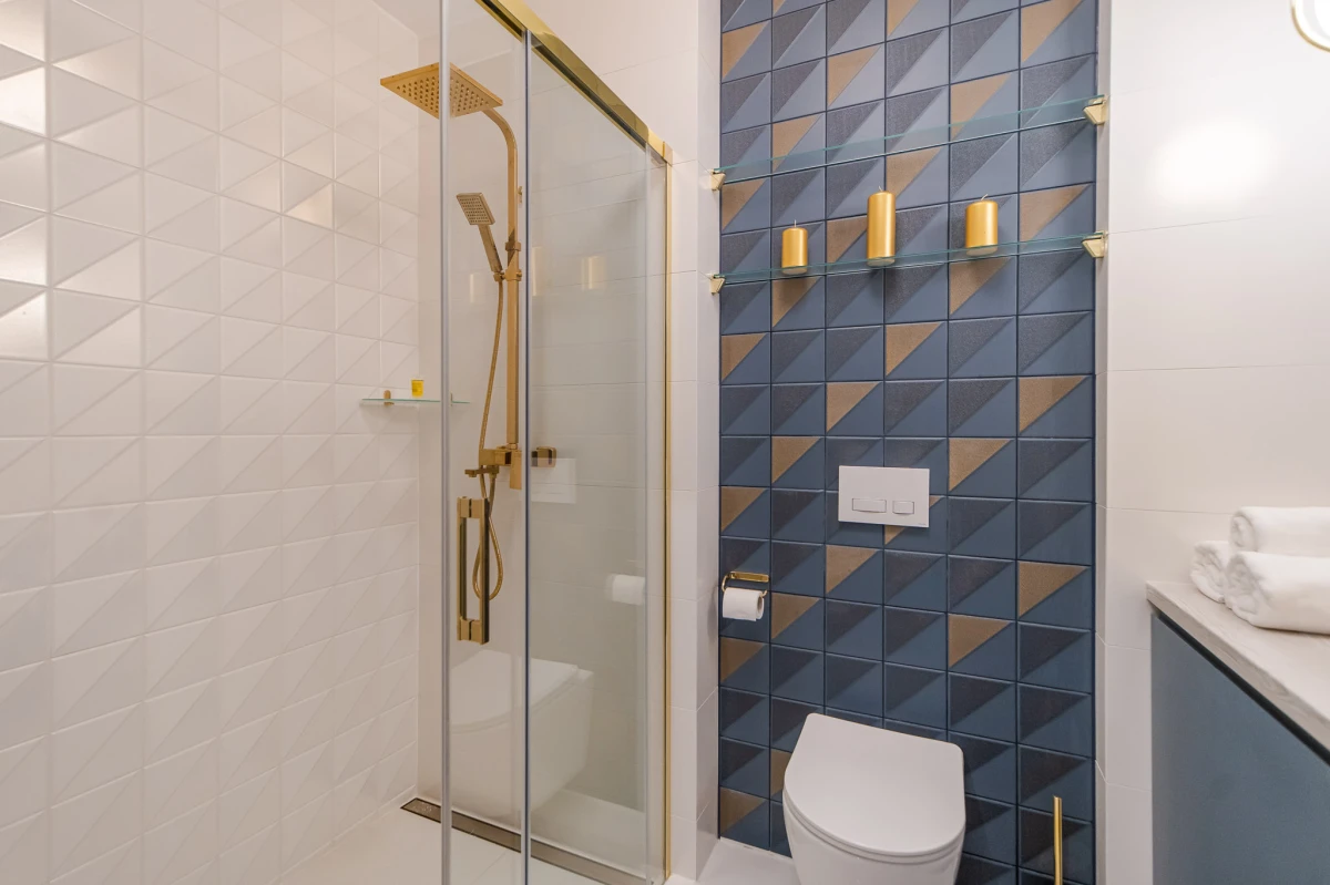 Ekskluzywna łazienka z prysznicem, pralką, suszarką do włosów oraz kompletem ręczników.