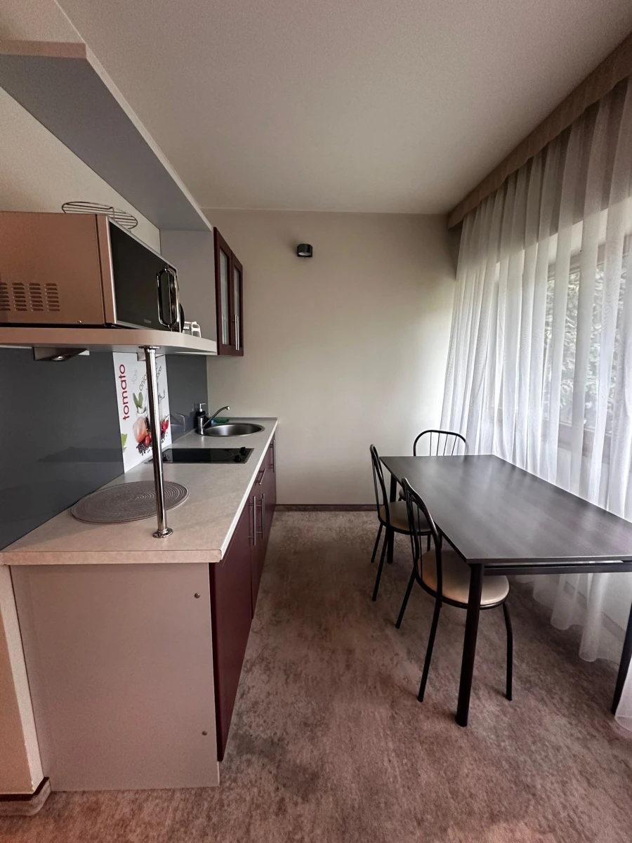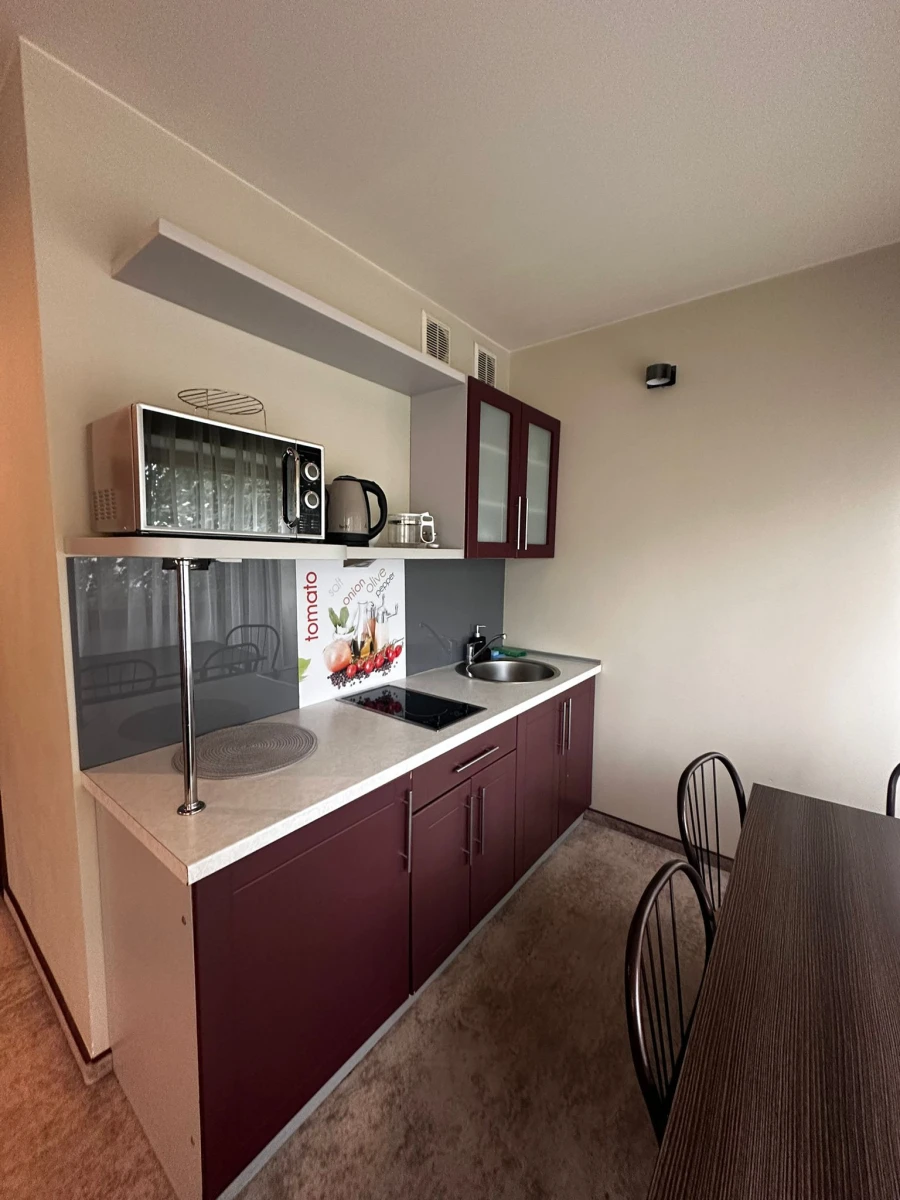 Apartament posiada przytulny balkon osłonięty od wiatru z zestawem 2 krzeseł i stolikiem, sypialnie z dużym łożem małżeńskim w systemie hotelowym ( lub 2 pojedyncze miejsca do spania) oraz salon z otomaną 2 os 2,5 m długości i aneksem kuchennym.