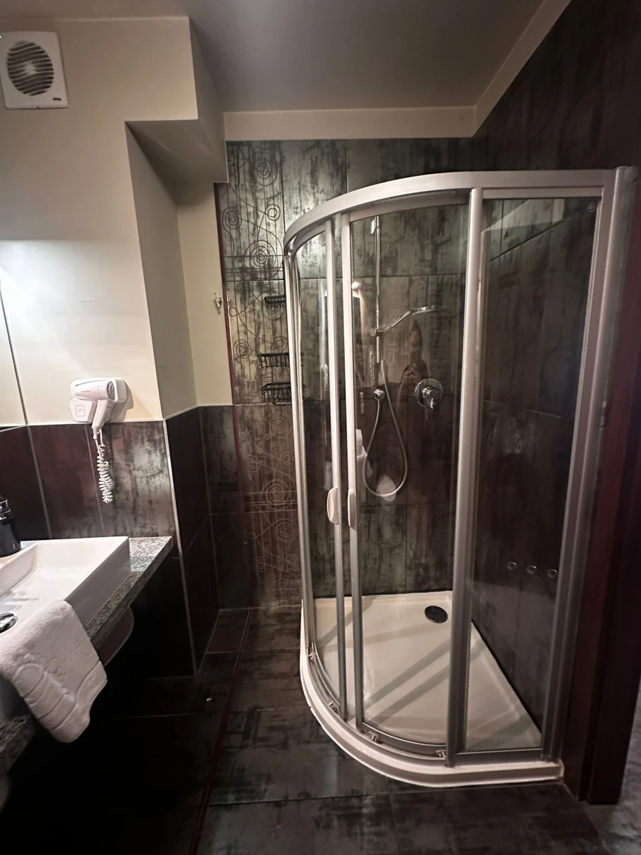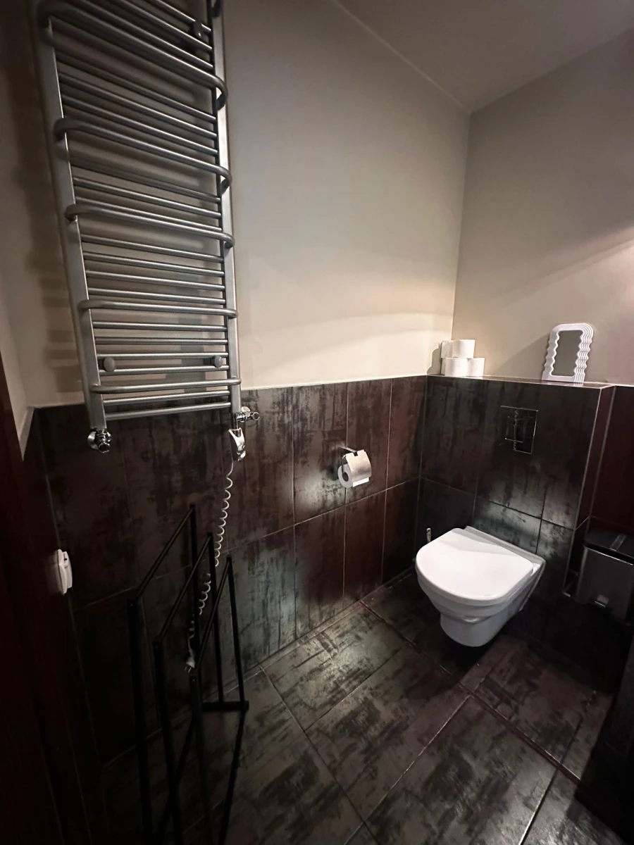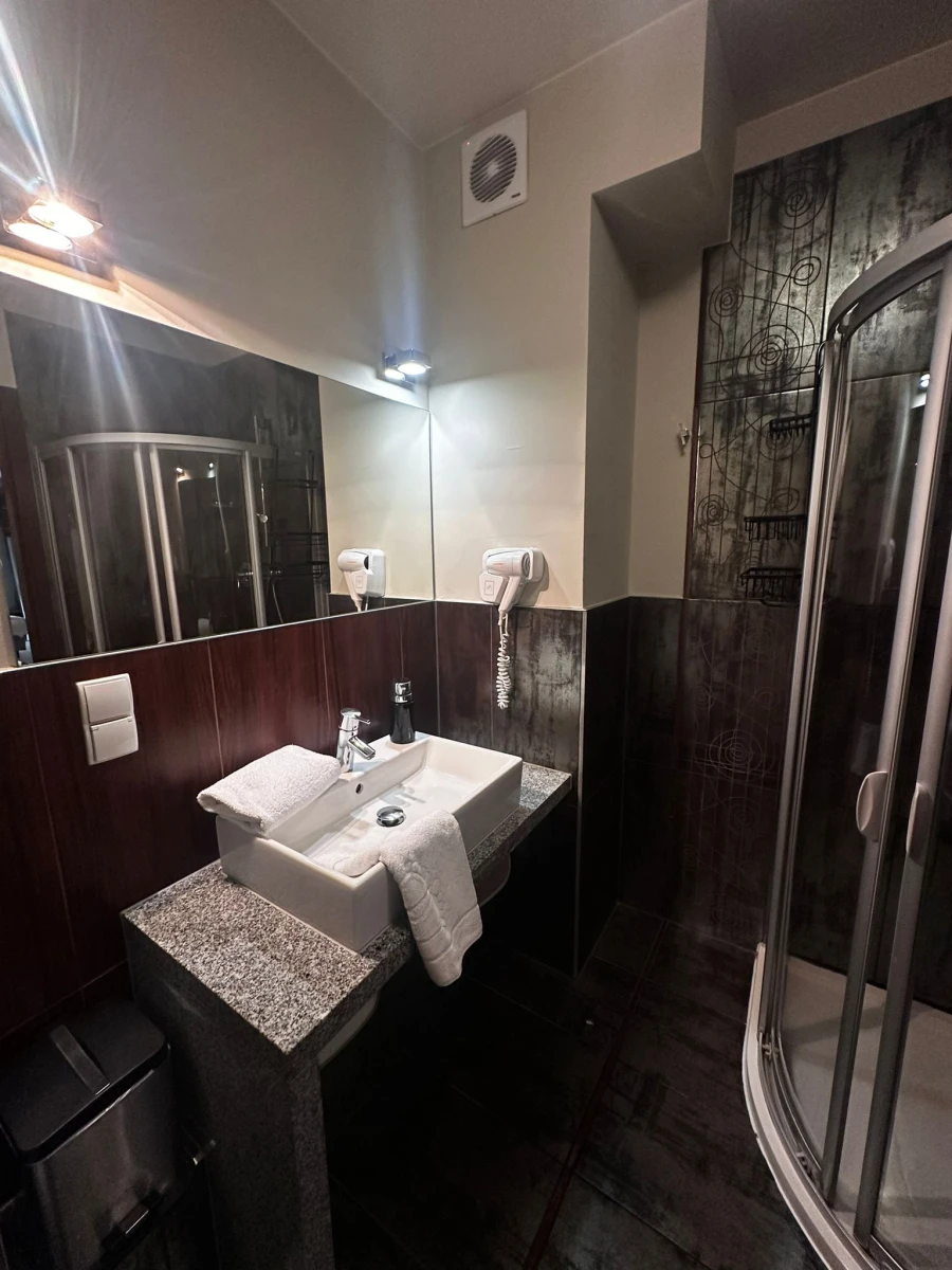 Elegancka i przestronna łazienka z kabiną prysznicową wraz z kompletem ręczników oraz szlafroków jak i suszarką do włosów . W apartamencie znajduje się aneks kuchenny przystosowany do zaspokajania codziennych potrzeb. Apartament przystosowany dla 4/5 osób.