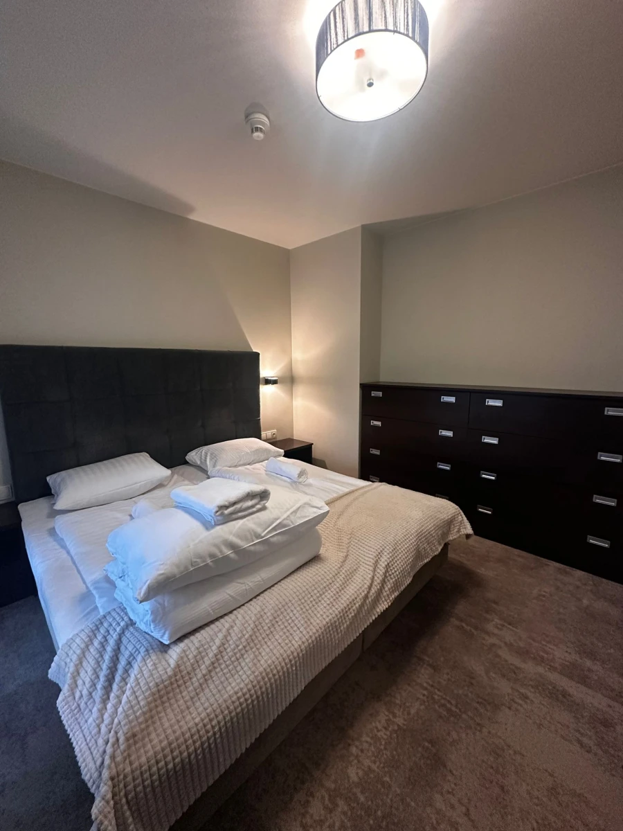 Wyposażenie pokoju: Powierzchnia 42 m2, Lodówka, Płyta kuchenna, Czajnik elektryczny, Toster, Kuchenka mikrofalowa, Garnki, Naczynia , Sztućce, szklanki, kieliszki, Bezpłatne Wi-Fi, Pościel, Ręczniki, Żelazko, deska do prasowania, Sejf, Sprzęt plażowy, Telewizor z płaskim ekranem , Duże łóżko 180x200, otomana rozkładana -pełnowymiarowa, Szafa, szafki, stół, krzesła, Łazienka z prysznicem, Suszarka do włosów.