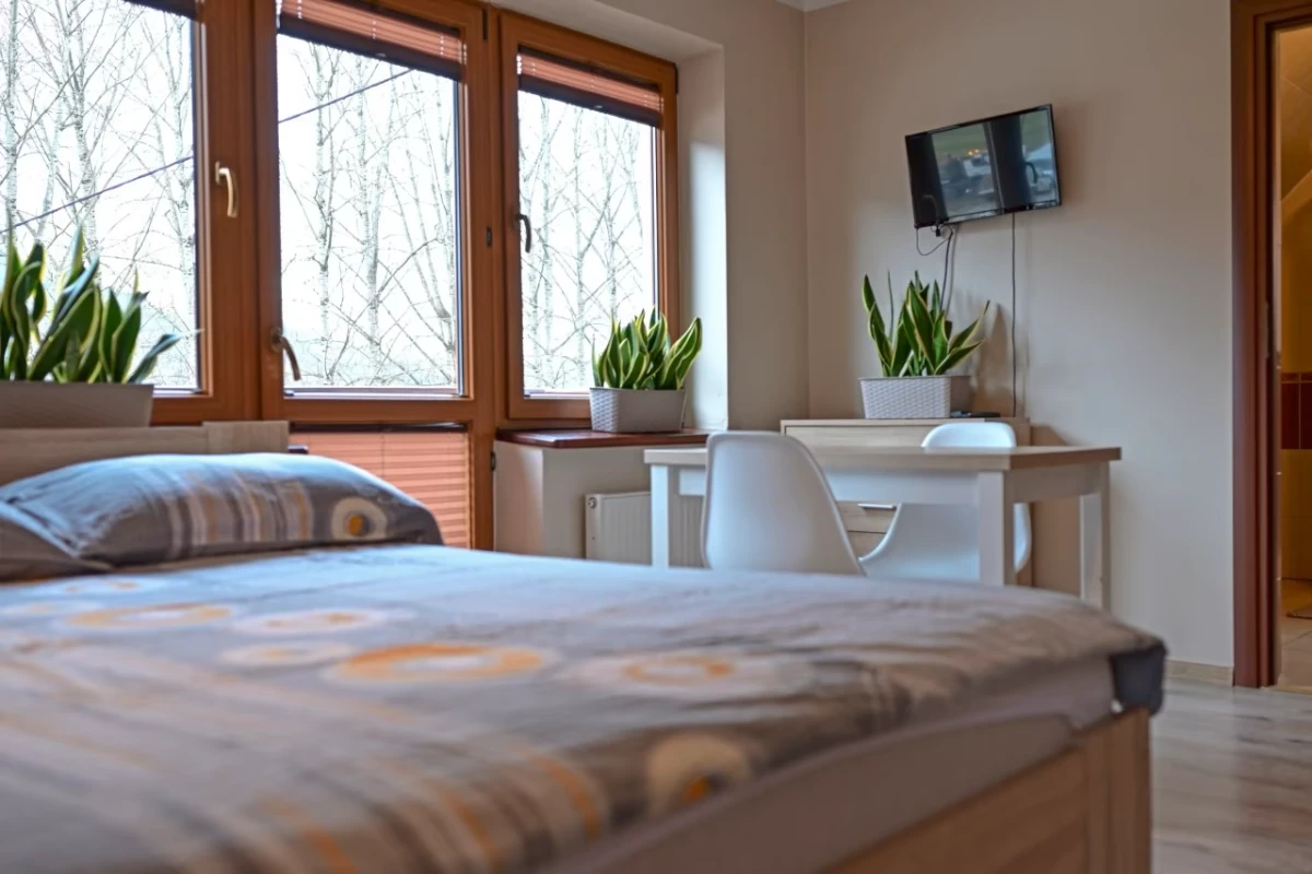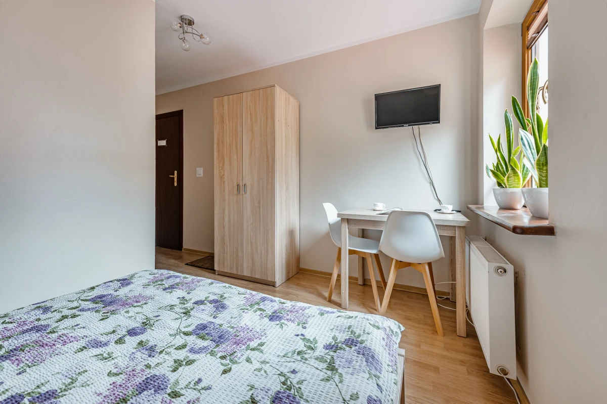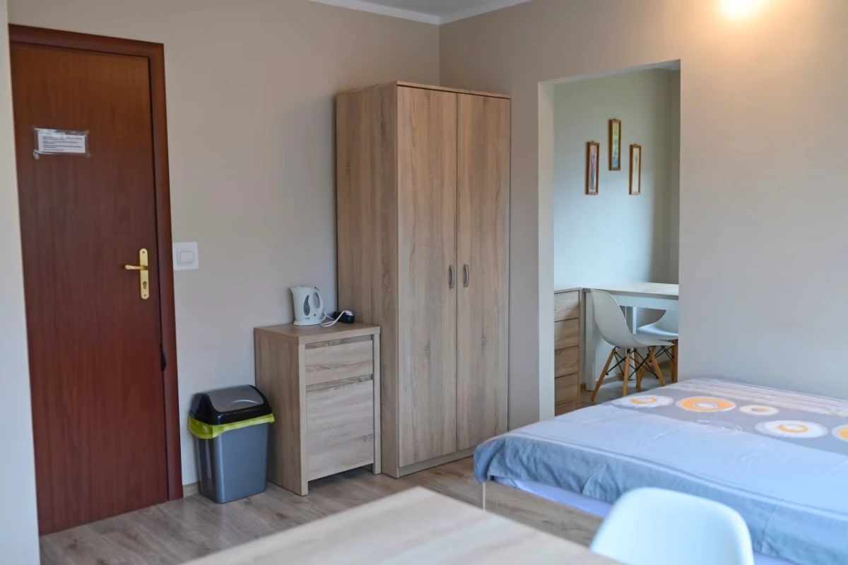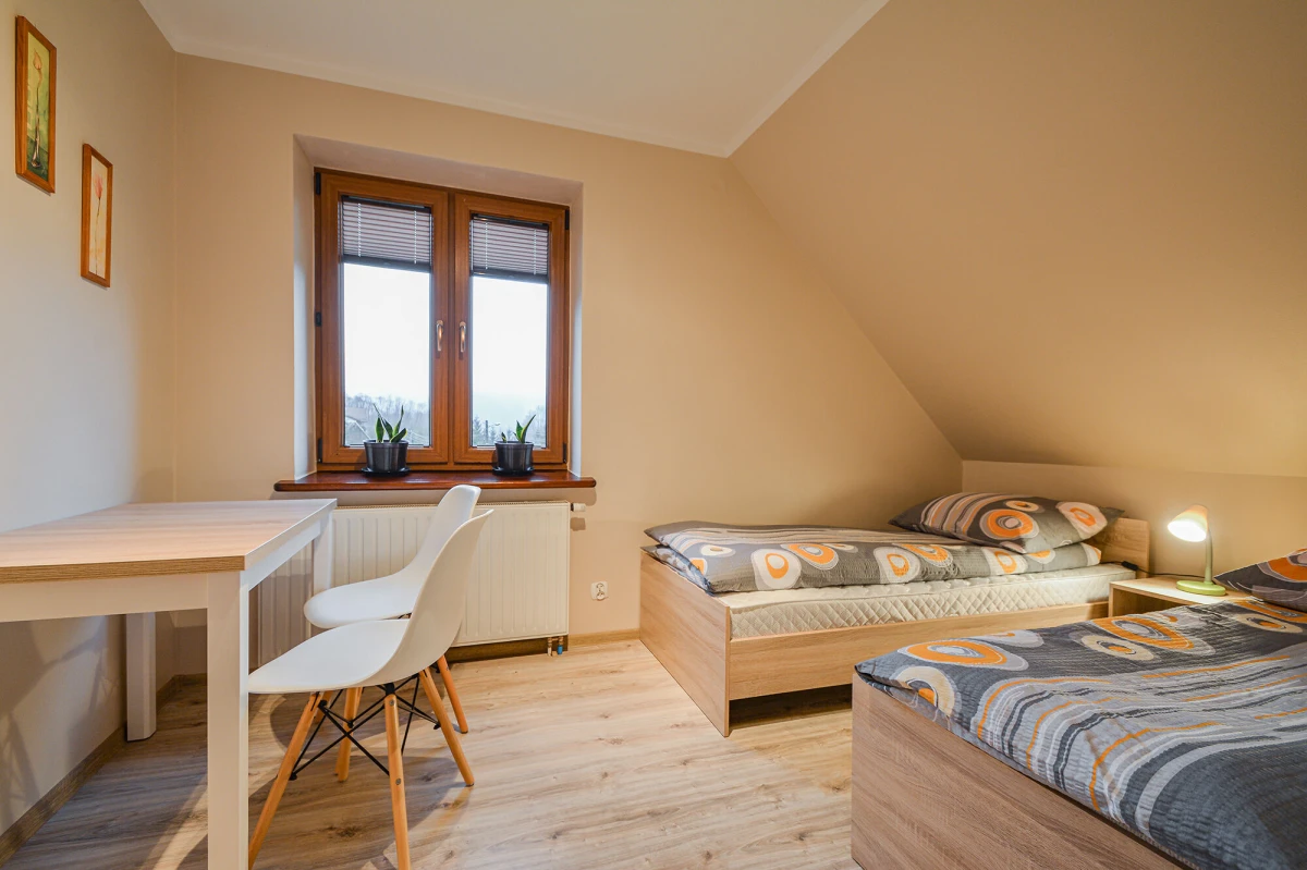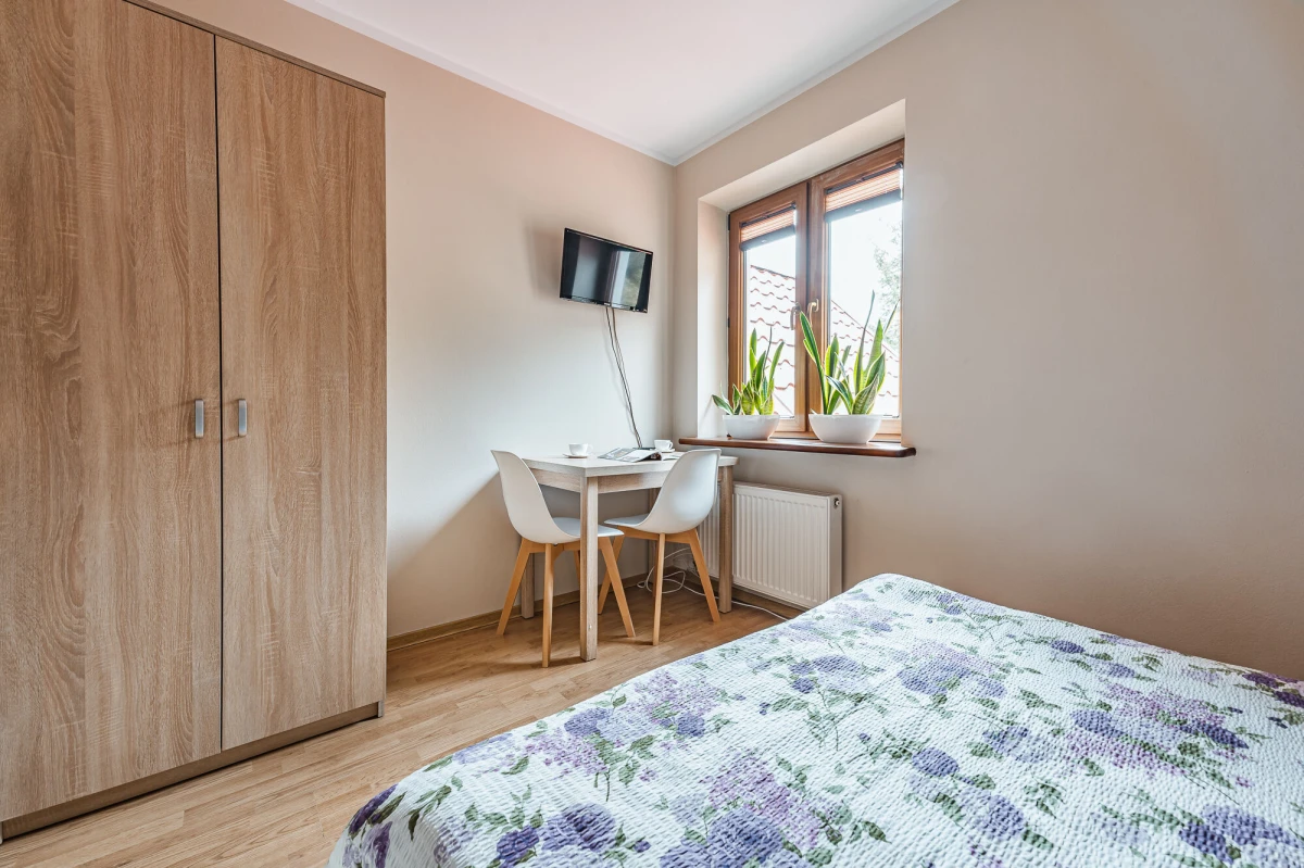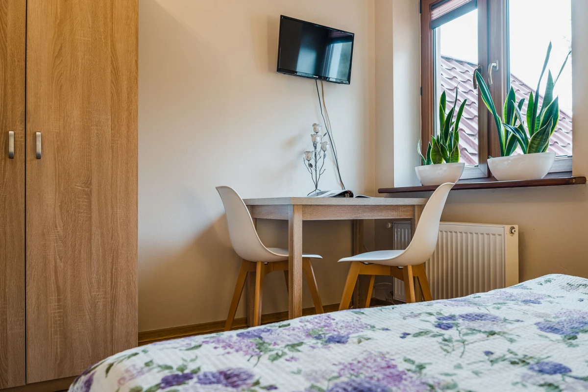 każdy pokój posiada: łazienkę z kabiną prysznicową, TV, Internet bezprzewodowy, wygodne nie piętrowe łóżka, szafy garderobiane, wygodne duże stoły, krzesła z oparciami,