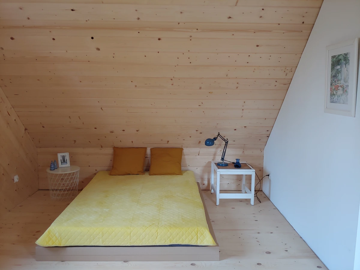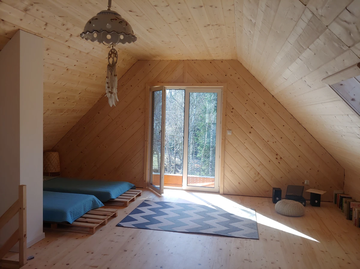 poddasze - wysoka przestrzeń otwarta dla 4 osób (z łóżkiem dwuosobowym i dwoma miejscami pojedynczymi),