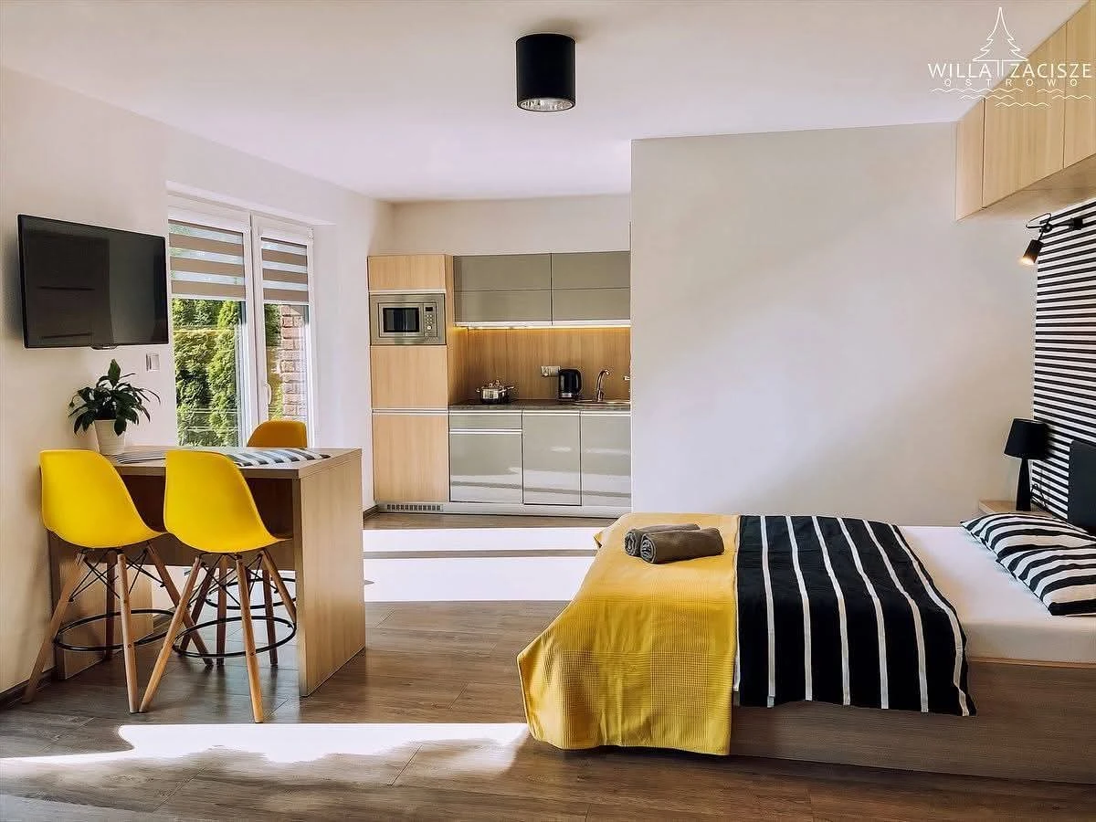 Willa Zacisze - apartamenty, studia i pokoje. Oaza spokoju, ciszy i zieleni. Położona jest w najbardziej zacisznym i urokliwym miejscu Ostrowa, otoczona malowniczym lasem sosnowym. To wyjątkowe miejsce, którego nie znajdziesz nigdzie.