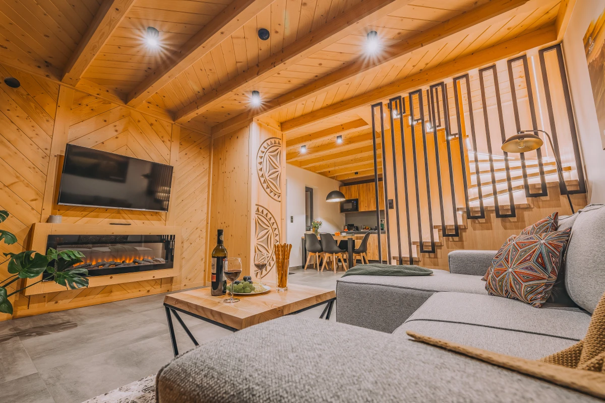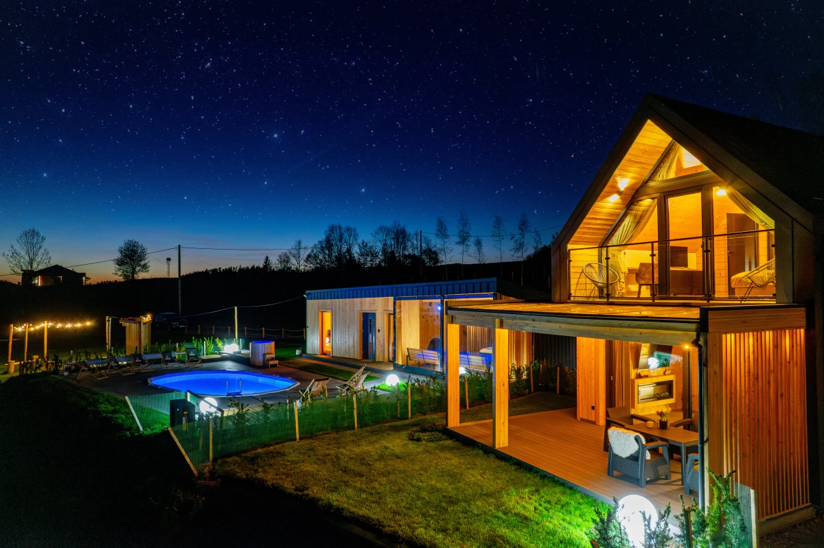 Każdy z domków jest znakomicie wyposażony. Oprócz wszystkiego, co niezbędne w kuchni, znajdziecie tutaj pralkę, suszarkę na pranie, deskę do prasowania, żelazko, szybkie wifi, a długie wieczory umili wam ulubiony serial na Netflix.