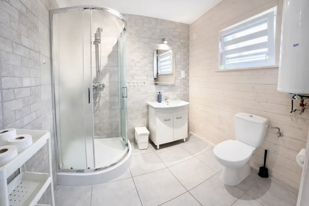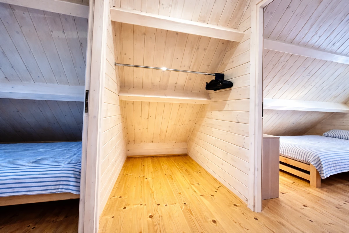 Na piętrze w domku znajdują się DWIE ZAMYKANE SYPIALNIE oraz garderoba. Na parterze zlokalizowany jest salon z dużym, narożnikiem z funkcją spania oraz TV 32 cale, jadalnia wyposażona w stół z czterema krzesłami, kompletnie wyposażona kuchnia z lodówką, płytą indukcyjną, czajnikiem elektrycznym, łazienka wykończona płytkami ceramicznymi w połączeniu w drewnem, z wygodną kabiną prysznicową, toaletą, oraz umywalką.
