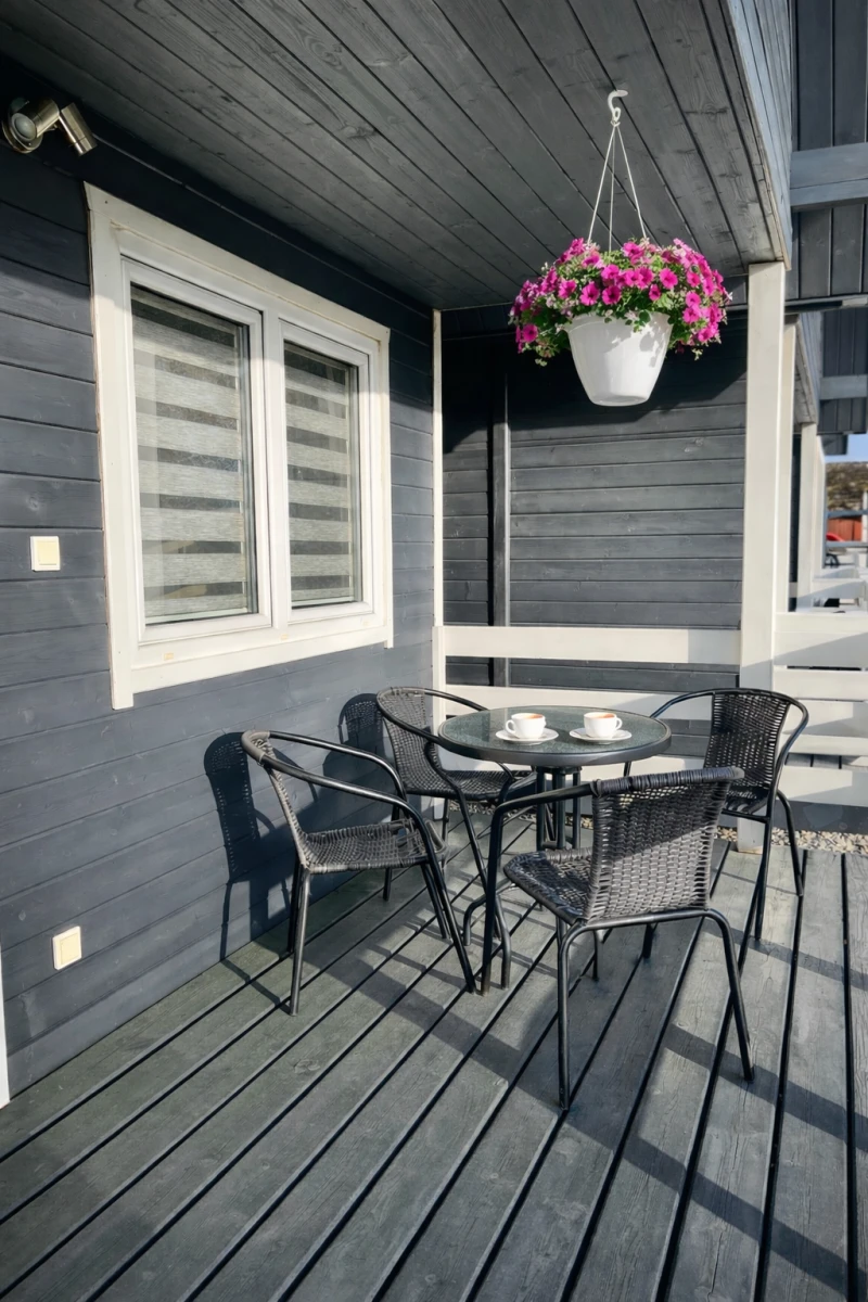 Domki posiadają ZADASZONE TARASY wyposażone w krzesła, stoły oraz grille co pozwala naszym gościom na spędzenie wielu godzin na świeżym powietrzu, a wspólny posiłek w gronie rodziny i przyjaciół na tarasie jest przyjemnością bez względu na warunki pogodowe.